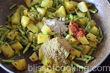 - Now add all the dry masalas and toss. Cover and cook for a minute.