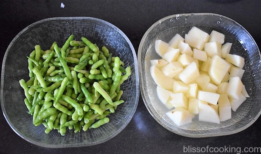 - Peel and cut the potatoes in cubes of medium to small size and dip in water. Strain just before cooking.
