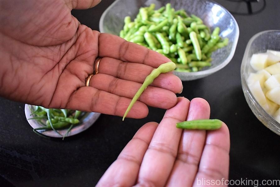 - Trim both the ends of the mogri falli. If too long cut them and set aside.