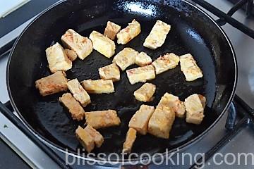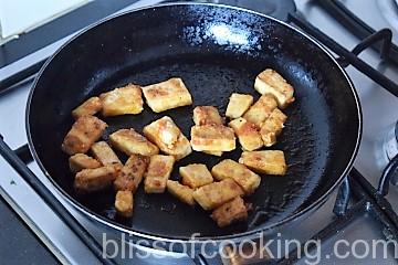 - Heat oil in a pan; and transfer the marinated tofu in a layer. Stir fry by turning so as to fry on all the sides. Set aside.