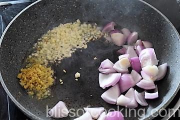 - In the same pan add onion, ginger, garlic and saute on high heat for 2 minutes.