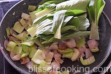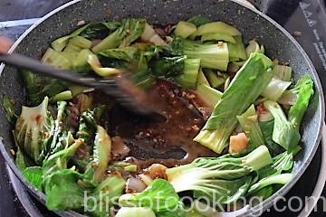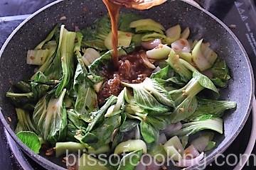 - Add the bok choy stem and saute for a minute.