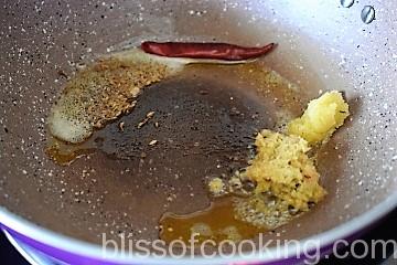 • Heat 1 tablespoon ghee in a pan; add jeera, hing and dry chilli.