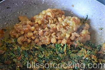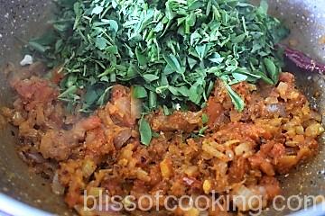 • Add chopped methi leaves and saute for 2 minutes or till dry.