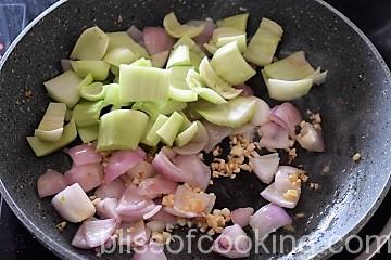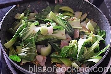 - Add the bok choy stem and saute for a minute.