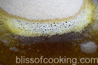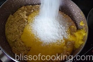 - Add sugar and stir till the sugar melts and the halwa is thick.