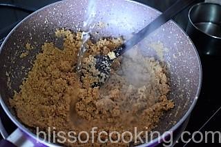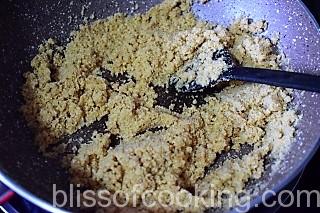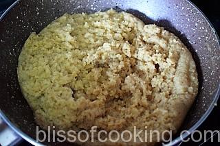 - Heat 1/3 cup ghee in a pan; add suji and saute on low heat till golden.