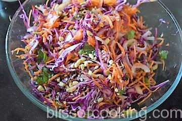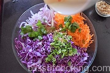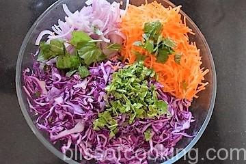 I love red/purple cabbage and always have it in my fridge. It stays fresh for long and comes in handy when I am short on lettuces. I find this versatile vegetable as a good replacement for lettuce. As I always have basil, mint and other herbs growing in my Balcony Garden I end up making this salad often.