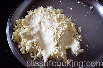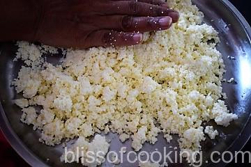 - Transfer the paneer (chenna) in a plate and kneed it with heal of your palm for 10 minutes to a smooth dough like texture.