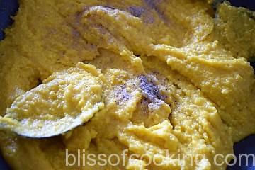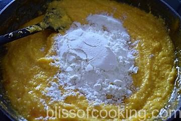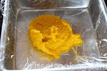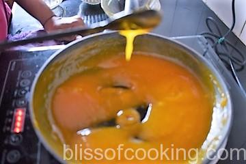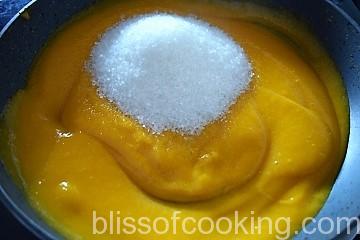 - Heat a pan; add mango puree and sugar and stir continuously to make a thick paste (glaze).