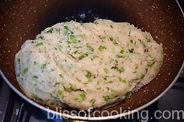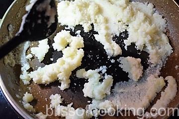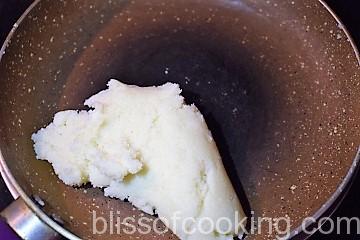 - Pour water in a pan; add oil, suji and cook to make a lump. Cool this.