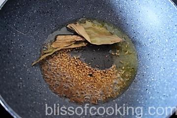 - Heat ghee in a deep pan; add cumin and bay leaves and fry for a few seconds.