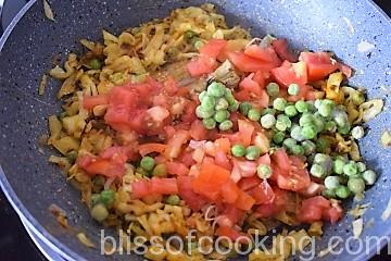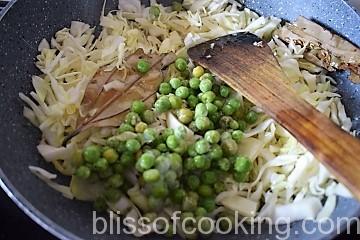 - Add the ginger and green chilli, cabbage, green peas and saute for 2 to 3 minutes.