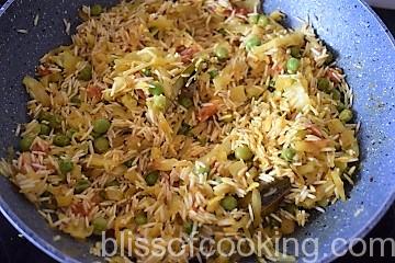 - Drain the rice, add to the vegetables and saute till the rice is well coated and translucent.