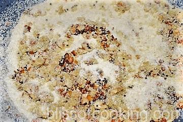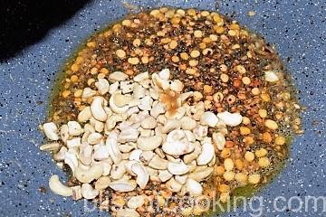 - Heat ghee in a pan; add mustard, jeera, urad, Chana dal and saute till the dal is golden.