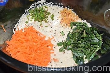 - Switch off the heat; add ginger, chilli’s, curry leaves and mix. Let the semolina / sujii mix come to room temperature, then transfer to a big bowl.