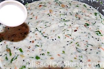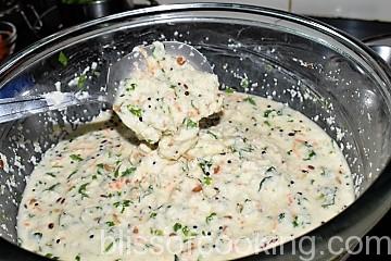 - Add salt, curd, water and make a batter of medium consistency which is neither too thick nor too thin. This batter should not have lumps.