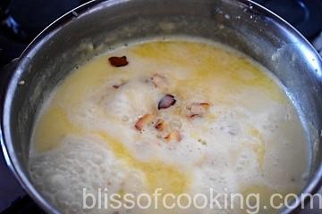 - Heat ghee in a pan; add cashew and fry till golden, then add raisins and saute for a few seconds, drain and set aside.