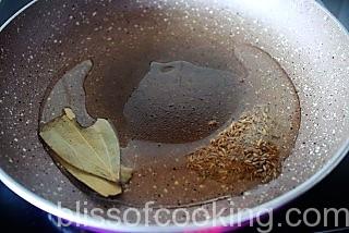 - Heat oil in a pan; add jeera, bay leaves, onions and saute till the onions are translucent.