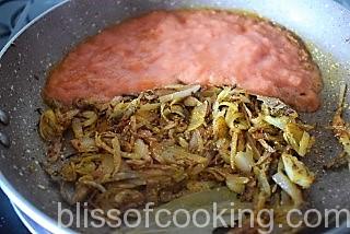 - Grind tomato, ginger, garlic, cardamom, cloves, cinnamon and mace to a paste and set aside.