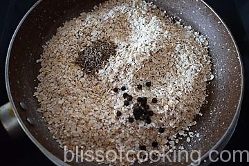 - In a pan add the oats, jeera, pepper and dry roast on medium heat till oats start to change colour. Let it cool and then grind to a coarse powder.
