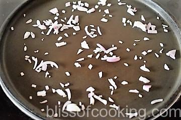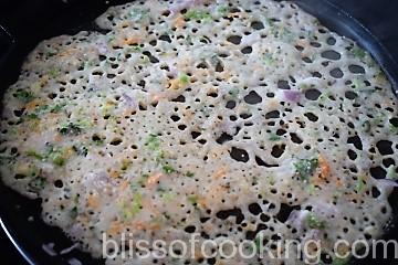 - Now sprinkle few pieces of onions and pour a ladle full of dosa batter starting from outside towards center of tawa (as done for rava dosa) . Do not try to spread with the ladle as you do for normal dosa.
