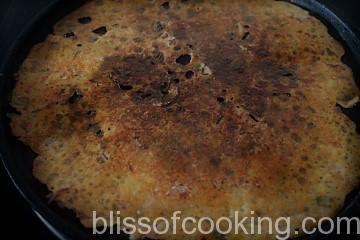 - Smear a few drops of oil around the dosa and let it cook till golden. Flip and cook till crisp.