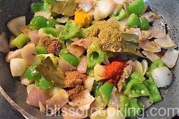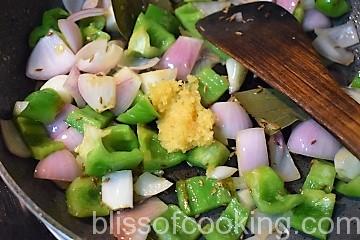 • Heat ghee in a pan; add jeera, bay leaves, onions, capsicum and saute for 2 to 3 minutes.