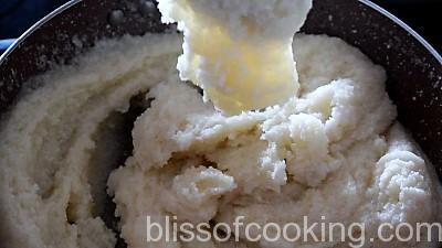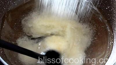 - Pour water in a pan; add oil, suji and cook to make a lump. Cool this.