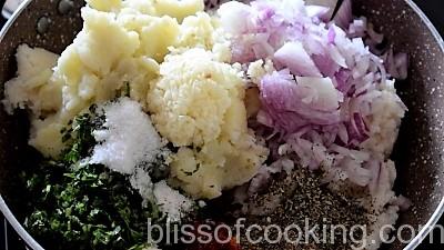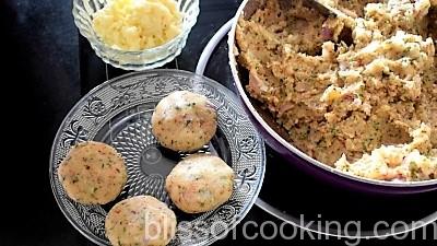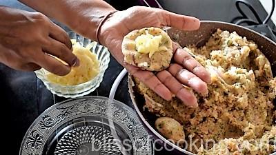 - Now flatten each ball, stuff a portion of cheese and close the balls. Press gently to form patties.