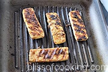 - Heat a grilling pan; drizzle with ½ teaspoon oil and place a few slices of tofu at a time to grill. Turn and grill well on all sides.