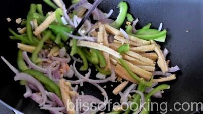 - Heat a wok on high heat; add rest of the oil. Add garlic and saute for few seconds, add onions, baby corns, capsicums and saute for a minute.
