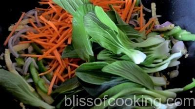 - Now add carrots, bok choy and saute till the leaves start to shrink.
