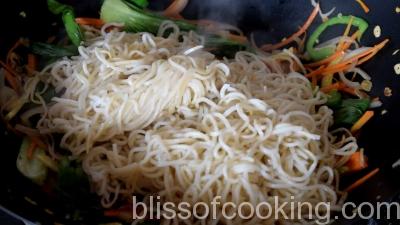 I have used a lot of vegetables, cut into very thin sticks/ match sticks. It is very important to cut them thinly, so that less cooking time is required and veges remain crunchy. Another very important thing is to get the wok and oil very hot. For this recipe I have pan fried the noodles separately before adding them to the vegetables. By doing so the noodles become a little crisp and dry. They absorb the flavors well. I have used sesame oil as it has a nutty flavor but any other oil can be used.