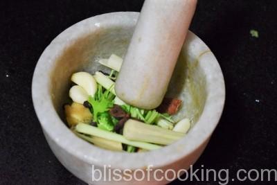 - Combine all the ingredients for the stock in a mortar pestle and bash. Add to the water in the pot and let it boil.