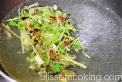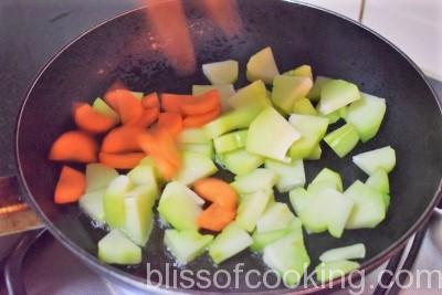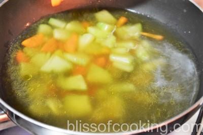 - Heat oil in a pan; add squash, carrot and saute for 2 minutes, add to the boiling stock.