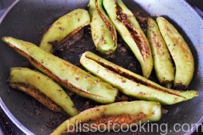 Chili’s cook quite fast, but if they are getting charred then cover with a lid with water on top or sprinkle a few drops and cover and cook. Do not worry if you have the besan stuffing left after filling the mirch. You can sprinkle this on the top after switching off the heat. This Besan Bhari Mirch (Stuffed Chilli) is different from the stuffed capsicum that is usually stuffed with a combination of vegetables and paneer (cottage cheese).