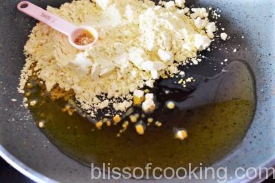 - Heat 1 tablespoon oil, add the hing, besan (gram flour) and saute till golden.