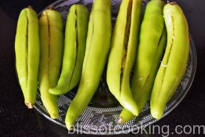 - Take a sharp knife and split the green chilly vertically. Keeping one side intact, slit from the other side.