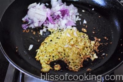 • Heat a large pan over medium heat; add butter, garlic and onions. Saute till pink.