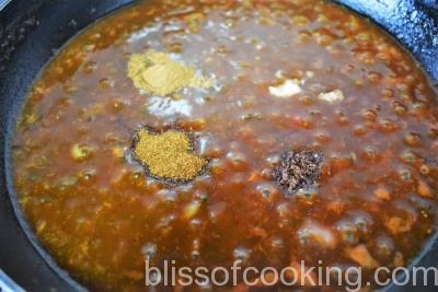 • Now add salt, black pepper, cloves, cinnamon, cayenne, water and stir well.