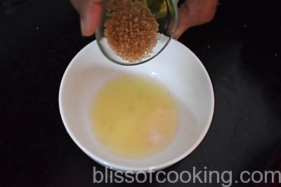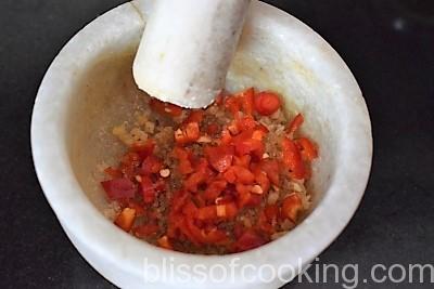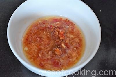 • In a bowl; place lime juice, sugar, salt and mix till sugar is dissolved. Add the sesame oil and mix. Crush the chilli, ginger and garlic in a mortar pestle; add this paste to the sugar, salt, oil and lime juice mix and set aside.