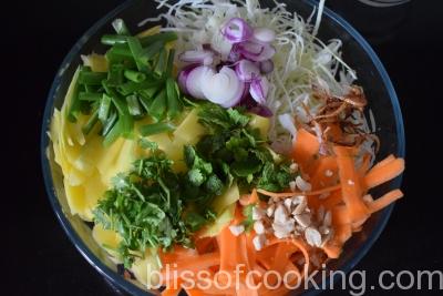 • In a large bowl, combine the mango, carrot, cabbage, spring onions, mint, coriander, and peanuts.