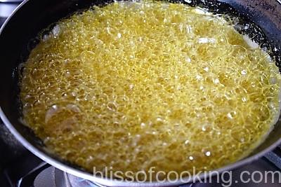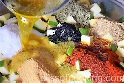 - Now heat the oil in a pan; add hing (asafoetida) and pour this on the mangoes.