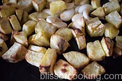 - Preheat the oven to 400 degrees Fahrenheit. Place the sweet potatoes and garlic on a baking sheet. Drizzle oil and sprinkle salt. Roast until are soft, about 30 to 40 minutes or longer. Set aside to cool completely.