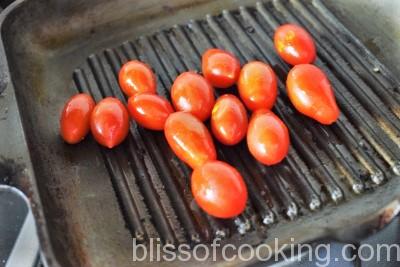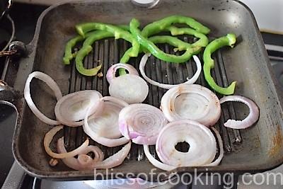 - Heat 1 teaspoon oil in a grill pan or cast iron or non-stick skillet over medium heat. When it’s hot, place the tomatoes, onion slices and capsicum to get grill marks. Remove and set aside.