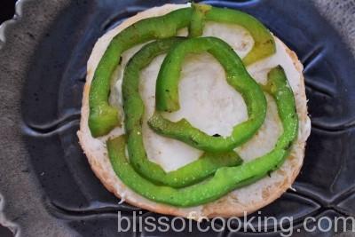 - Now assemble the burger by placing a few slices of capsicums, then the patties, followed by few drops of hot sauce. Place onions and a big dollop of avocado dip. Now close the burger.