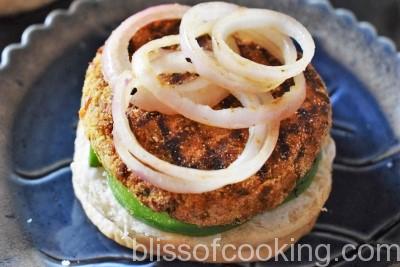 These easy veggie burgers has been made from scratch but don’t require a lot of time. Made from common ingredients easily available, these are tender without being mushy and not too sweet. I have grilled the patties as well as the veggies on a grill pan using very little oil. You can use whole wheat burger buns for this recipe to keep it healthy.
