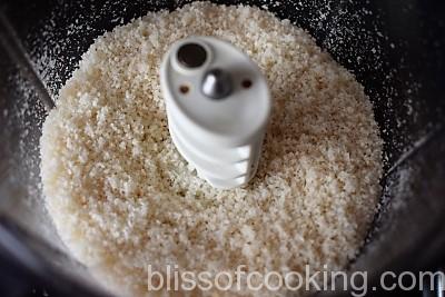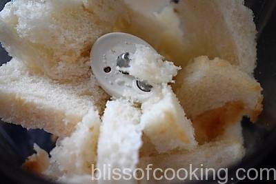 - Remove the sides of bread and make crumbs in a mixer. Set aside.