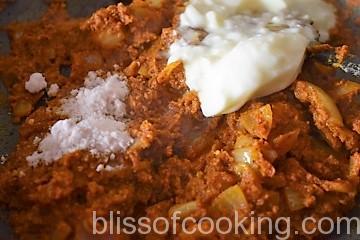 - Add in the dahi (curd), salt and saute for 2 minutes.
